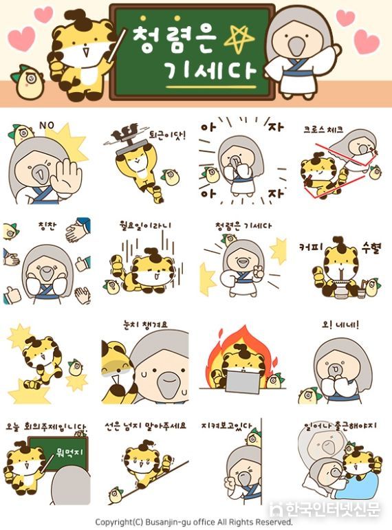 ‘청렴은 기세다’를 타이틀로 한 이번 이모티콘은 부산진구 SNS 캐릭터 백양할배와 호천냥이 뿐만 아니라 새롭게 탄생한 부산 정중앙 캐릭터 부중이 등을 활용해 16종으로 구성됐다.