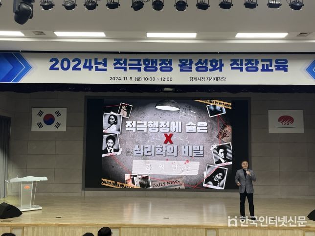 한국현대미술신문 강경숙 기자 | 김제시는 8일 시청 대강당에서 김희옥 부시장을 포함한 직원 340여명을 대상으로 적극행정 확산 및 소극행정 타파를 위한 공무원 필수 교육인 '2024년 적극행정 활성화 직장교육'을 2시간에 걸쳐 실시했다고 밝혔다.