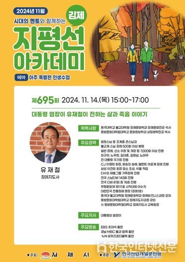 한국현대미술신문 강경숙 기자 | 김제시는 오는 14일 제695회 지평선아카데미에 유재철 장례지도사를 초청해 “대통령 염장이 유재철이 전하는 삶과 죽음이야기”라는 주제로 강연을 진행한다고 밝혔다.