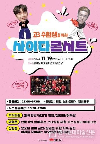 한국현대미술신문 강경숙 기자 | 김제시는 오는 19일 오후 4시 30분부터 문화예술회관 대공연장에서 “고3 수험생 및 청소년을 위한 사이다 콘서트”를 개최한다고 밝혔다.