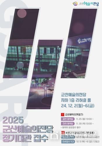 한국현대미술신문 강경숙 기자 | 군산예술의전당이 지역예술가들과 문화프로그램 운영자들을 위한 2025년도 군산예술의전당 정기대관 신청을 12월 2일부터 시작한다. 신청 기간은 12월 2일부터 6일까지 5일 동안이다.