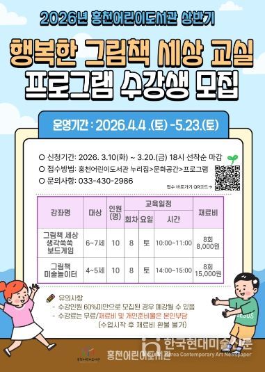한국현대미술신문 원진 기자 | 홍천군은 영유아의 독서 흥미를 높이고 보호자와 아이가 함께 책과 친해질 수 있도록 2026년 상반기 '북스타트 책놀이' 프로그램 수강생을 모집한다.