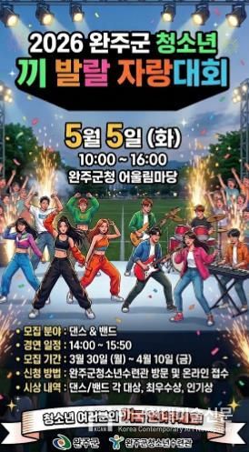 한국현대미술신문 기자 | 완주군이 오는 5월 5일 제104회 어린이날에 아동과 청소년들이 주인공이 되어 숨겨진 재능과 에너지를 마음껏 발산할 수 있는 ‘2026 완주군 아동·청소년 끼 발랄 자랑대회’를 개최한다.