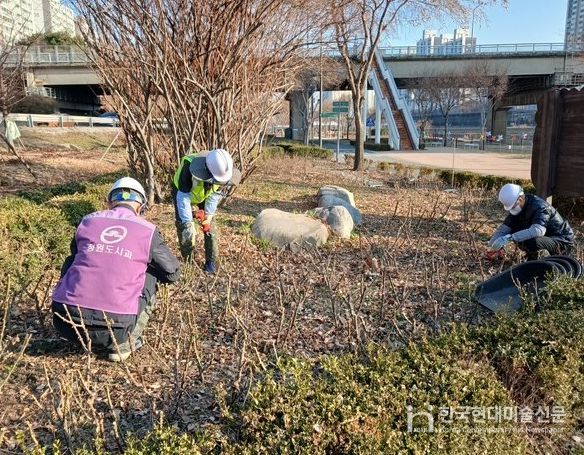 한국현대미술신문 배건 기자 | 서울 동대문구가 중랑천 장미 식재지의 개화 품질 향상을 위해 자체 인력을 활용한 장미 관리에 나섰다.