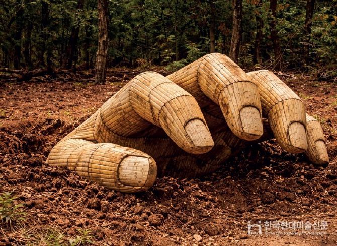 땅에서 솟아오르는 거대한 대나무 손은 인간의 고된 노동이 숭고한 생명 지탱의 몸짓으로 승화되는 상호성의 제스처를 상징하며, 대지가 살아있는 변형의 주체임을 시사한다.