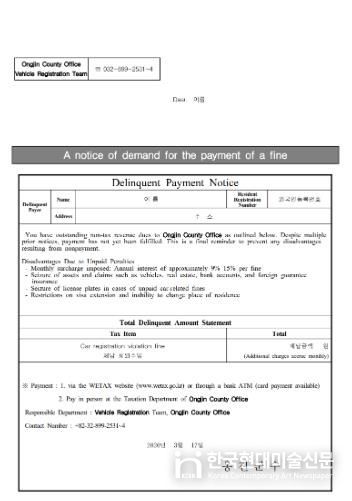 한국현대미술신문 박재남 기자 | 옹진군이 자동차 과태료 외국인 체납자들을 대상으로, 영어로 번역된‘자동차 과태료 체납 안내문’을 발송한다고 밝혔다.