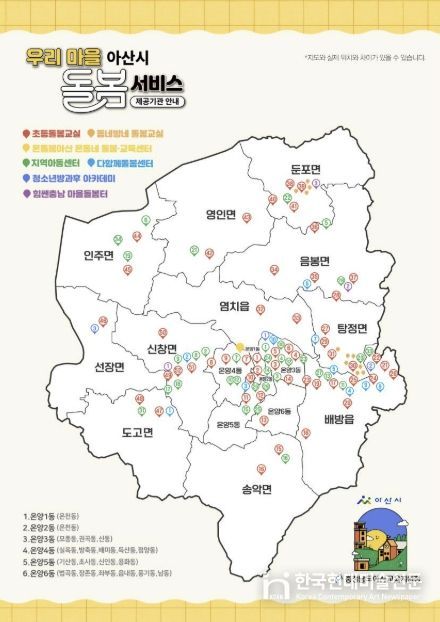 영유아 돌봄은 권역별 ‘365×24 어린이집’을 중심으로 운영된다. 생후 6개월부터 취학 전까지를 대상으로 평일 야간과 새벽, 주말 및 공휴일에도 보육 서비스를 제공한다. 이용료는 시간당 2,000원이다. 현재 배방읍과 온양3동 등 2개소가 운영 중이며, 상반기 중 음봉면과 둔포면에 2개소가 추가로 문을 열 예정이다.