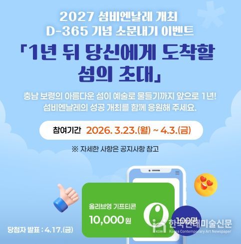 한국현대미술신문 신정은 기자 | 섬비엔날레조직위원회는 3월 23일부터 오는 4월 3일까지 약 2주간 섬비엔날레 개최 D-365일을 맞아 대국민 온라인 참여 이벤트를 진행한다고 밝혔다.