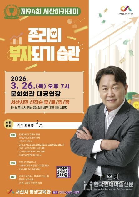한국현대미술신문 신정은 기자 | 충남 서산시는 ‘존리의 부자학교’ 존 리 대표를 초청해 제94회 서산아카데미를 개최한다고 밝혔다.