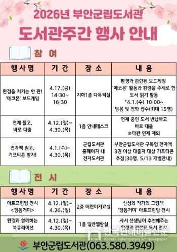 한국현대미술신문 기자 | 부안군립도서관은 2026년 도서관의 날(4월 12일)과 도서관주간(4월 12~18일)을 맞아 지역 주민들을 위한 다채로운 독서 문화 행사를 운영한다고 밝혔다.