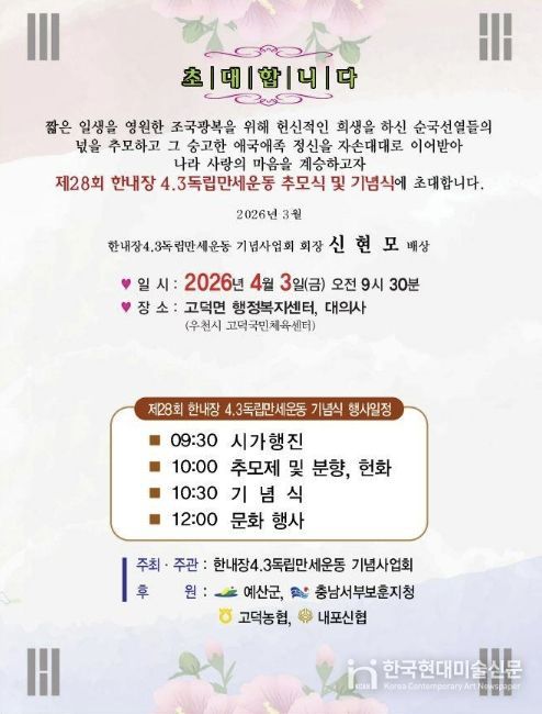 한국현대미술신문 신정은 기자 | 예산군은 4월 3일 고덕면 한내장터 일원에서 ‘제28회 한내장 4·3 독립만세운동 기념행사’를 개최한다고 밝혔다.