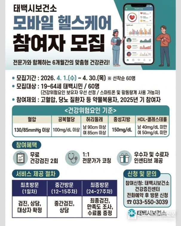 한국현대미술신문 원진 기자 | 태백시는 지역주민의 건강한 생활습관 형성을 지원하기 위해 ‘2026년 모바일헬스케어 사업’ 참여자를 모집한다고 밝혔다.