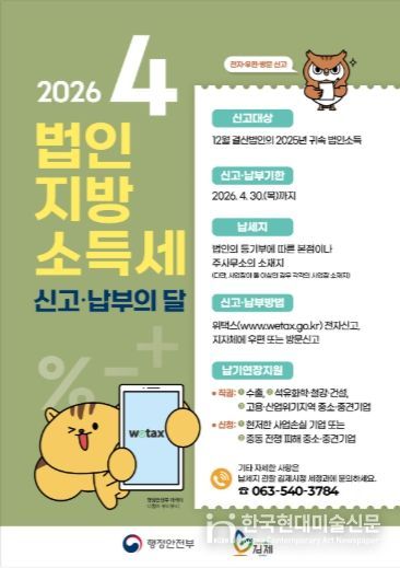 한국현대미술신문 기자 | 김제시는 이달 한달 동안 2025년 귀속 법인지방소득세 신고·납부의무 법인이 성실하게 납세의무를 이행할 수 있도록 각 법인에 안내문을 발송하고 시청 홈페이지, SNS 게시 등 다각적인 홍보활동에 나설 예정라고 밝혔다.