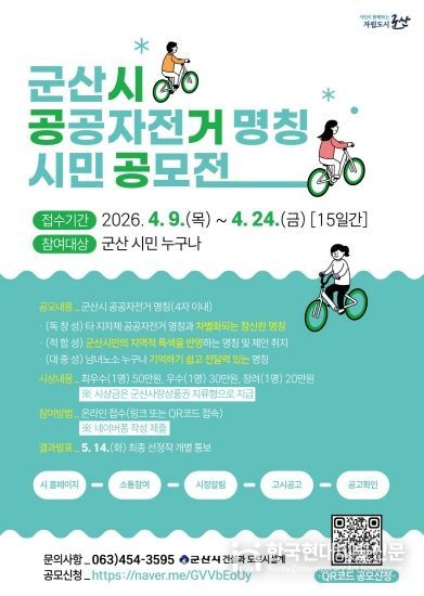 한국현대미술신문 기자 | 군산시가 QR코드 방식의 공공자전거 대여·반납 시스템 개편에 맞춰, 시민이 직접 이름을 정하는 ‘공공자전거 명칭 시민 공모전’을 개최한다.