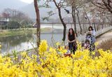 개나리 노랗게 물든 괴산 동진천, 봄나들이객 발길 이어져