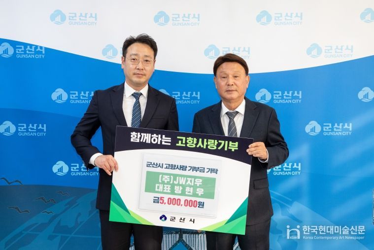 한국현대미술신문 강경숙 기자 | 25일 군산시 신생기업인 ㈜제이더블유지우의 방현우 대표이사가 군산시 고향사랑기부제에 동참하며, 500만원의 기부금을 기탁했다.