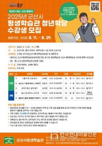 한국현대미술신문 기자 | 군산시평생학습관이 청년 강사들과 함께 지역사회에 활력을 불어넣는 ‘2025년 청년학당 프로그램’을 오는 8월 11일부터 8월 29일까지 운영한다.