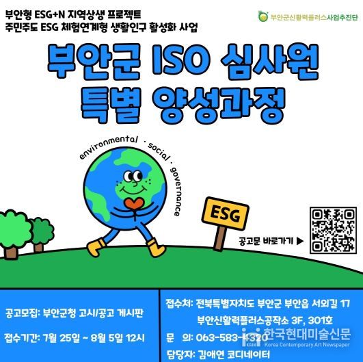한국현대미술신문 기자 | 부안군 신활력플러스사업추진단은 2025년 8월 9일부터 31일까지 매주 주말 총 4개 과정의 ‘ISO 국제공인심사원 특별 양성과정’을 부안읍 소재 ‘신활력공작소(서외길 17)’ 운영하며, 교육 참가자를 오는 8월 5일 낮 12시까지 모집한다고 밝혔다. 이번 교육은 부안형 ESG+N 지역상생 프로젝트의 일환으로 추진되며, 주민주도의 ESG 실천 기반을 강화하고 지역 기반의 ESG 전문 인력을 육성하기 위해 마련됐다.