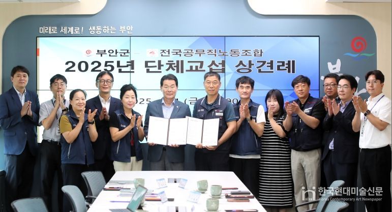 한국현대미술신문 기자 | 부안군과 전국공무직노동조합 부안군지부는 8월 1일 부안군청 중회의실에서 권익현 부안군수와 이권로 전국공무직노동조합 위원장 등 노·사 양측 교섭위원이 참석한 가운데 2025년 공무직노조 단체교섭 상견례를 가졌다.