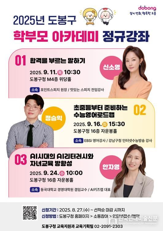 한국현대미술신문 배건 기자 | 서울 도봉구가 2학기 개학을 맞아 자녀 교육에 고민 많은 학부모를 위해 9월 한 달간 3번의 학부모 아카데미를 연다.