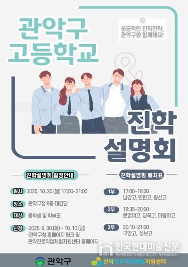 한국현대미술신문 배건 기자 | 관악구가 중학생과 학부모를 대상으로 오는 10월 20일 개최하는 ‘관악구 고등학교 진학설명회’ 참가자를 모집한다.