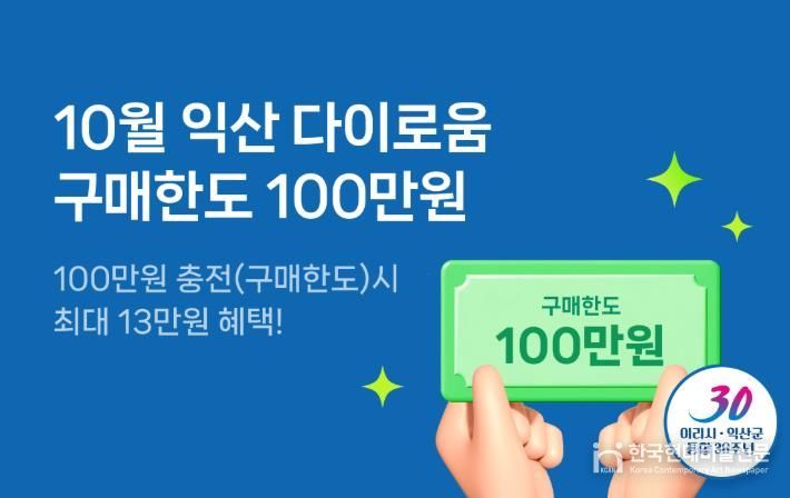 한국현대미술신문 기자 | 익산시가 이리시·익산군 통합 30주년과 시민의 날(10월 3일)을 기념해, 10월 한 달간 지역사랑상품권 '익산 다이로움'의 개인별 구매한도를 기존 60만 원에서 100만 원으로 확대한다고 30일 밝혔다.