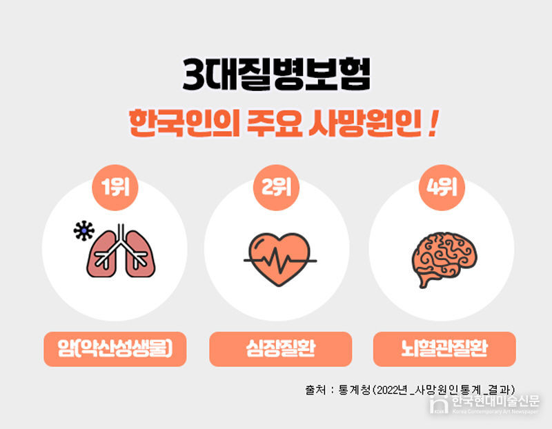 한국현대미술신문 김미정 기자 | 3대질병으로 일컬어지는 암, 뇌혈관질환, 심혈관질환은 한국인의 주요 사망원인에서 상위를 차지하고 있으며, 이에 대한 진단비를 집중적으로 보장해 주는 보험상품을 3대질병진단비 보험이라 할 수 있다.