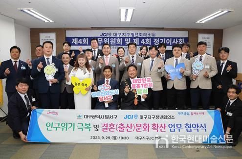 한국현대미술신문 정소영 기자 | 대구 달서구는 지난 29일 대구지구청년회의소(회장 이성범)와 초저출생 인구 위기 극복 및 긍정적 결혼문화 확산을 위한 업무협약을 체결했다.