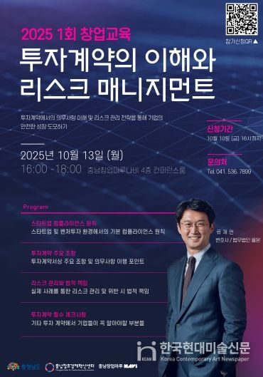 교육은 2025년 10월 13일 충남창업마루나비에서 진행되며, 류재언 변호사(법무법인 율본)가 강사로 참여해 스타트업 컴플라이언스 원칙, 투자계약 주요 조항, 리스크 관리 및 법적 책임, 투자계약 필수 체크사항 등을 상세히 강의할 예정이다.