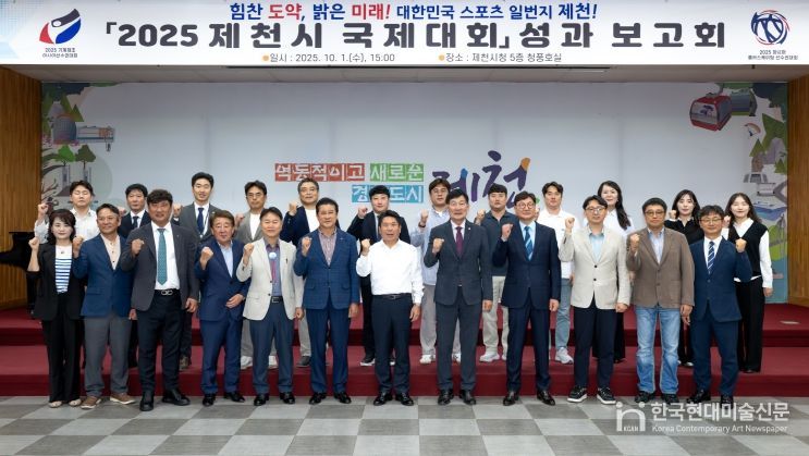 한국현대미술신문 신정은 기자 | 제천시는 지난 1일 제천시청 5층 청풍호실에서 '2025년 제천시 국제대회'성과보고회를 개최했다. 보고회에는 김창규 제천시장, 박영기 제천시의회 의장, 김경석 대한롤러스포츠연맹 회장(이상 공동조직위원장), 장재돈 대한체조협회 고문과 안성국 제천시체육회장(집행위원장), 오재성 제천시체조협회장, 최호열 제천시롤러스포츠연맹회장(이상 공동 사무총장) 및 유관기관, 단체장 3명과 종목단체 임원 및 회원 50여 명이 참석했다.