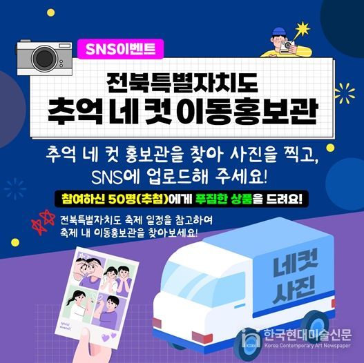 한국현대미술신문 기자 | 전북특별자치도는 10월 10일부터 11월 1일까지 도내 주요 축제 현장에서 ‘추억 네 컷 이동홍보관’을 운영한다고 밝혔다.