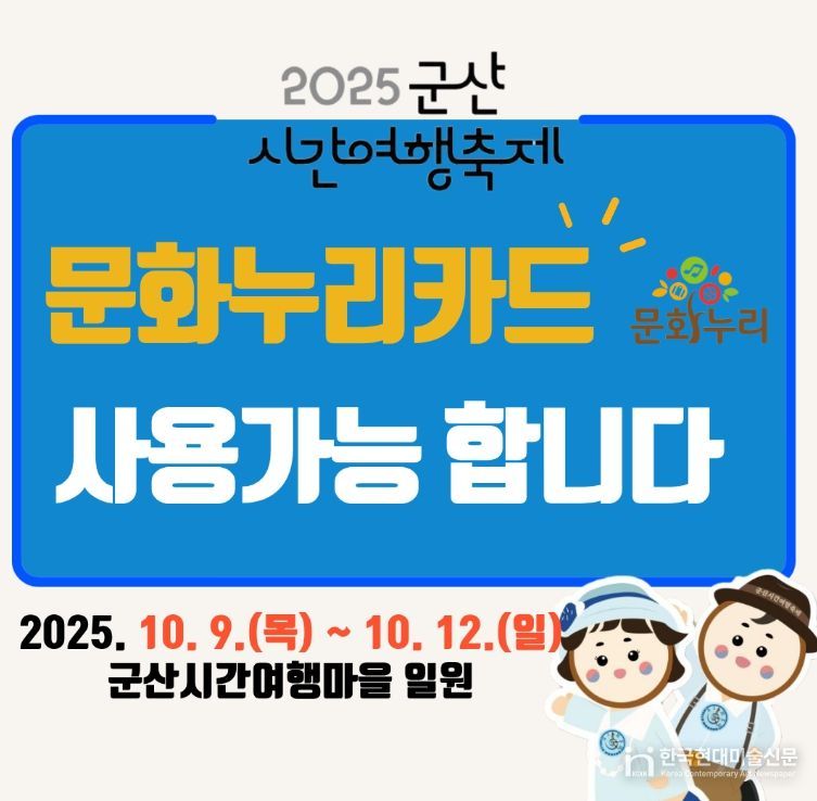 한국현대미술신문 기자 | 군산시가 12일까지 열리는 '2025 군산시간여행축제' 기간 동안 통합문화이용권(문화누리카드) 임시 가맹점을 운영해 시민들이 축제 현장에서 더욱 쉽고 편리하게 통합문화이용권(문화누리카드)를 사용할 수 있도록 지원했다.