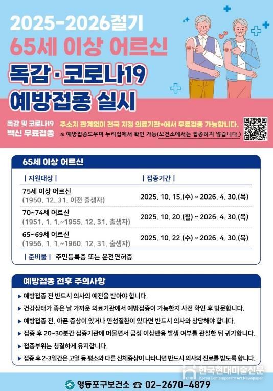 한국현대미술신문 배건 기자 | 영등포구가 겨울철 감염병 유행에 대비해 65세 이상 어르신을 대상으로 독감 및 코로나19의 동시 무료 예방접종을 권장한다고 밝혔다.