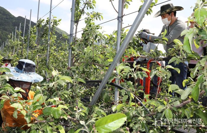 한국현대미술신문 기자 | 무주군이 잦은 기상 이변으로 인한 사과 수급 불안 요인을 차단하고 일손 부족으로 어려움을 겪는 농가들을 돕기 위해 현장에서 직접 사과 수확(후지)을 지원하고 있다고 밝혔다.