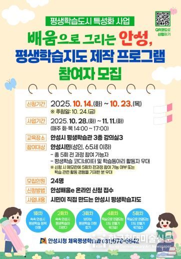 한국현대미술신문 배윤섭 기자 | 안성시는 시민 주도형 평생학습 프로그램인 '배움으로 그리는 안성 – 평생학습지도 제작 프로그램'을 오는 10월 28일부터 11월 11일까지 매주 화·목 14시부터 17시까지 안성시평생학습관에서 운영한다고 밝혔다