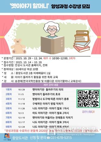 도서관 관계자는 “지역 어르신들이 삶의 지혜와 전통 이야기를 전하며 세대 간 소통의 다리를 놓는 뜻깊은 과정이 될 것이고 본 과정을 수료한 참여자들은 2026년 ‘책 읽어주기’ 자원봉사 프로그램에 참여할 수 있도록 안내할 계획이다.”라고 전했다.