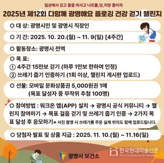 한국현대미술신문 배윤섭 기자 | 광명시 보건소는 오는 20일부터 11월 9일까지 4주간 ‘제12회 다함께 광명해요! 플로깅 건강 걷기 챌린지’를 운영한다.