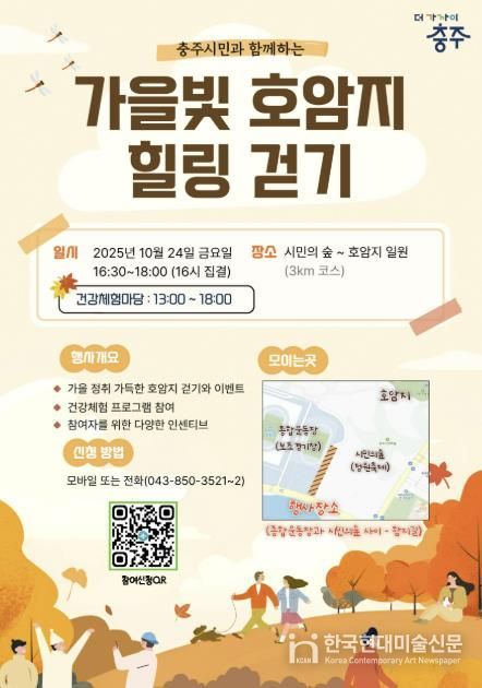 한국현대미술신문 신정은 기자 | 충주시는 걷기 좋은 가을을 맞아 오는 24일 시민의 숲과 호암지 일대에서 ‘가을빛 호암지 힐링 걷기’를 개최한다고 밝혔다.