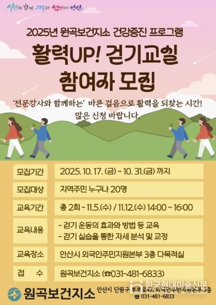 한국현대미술신문 배윤섭 기자 | 안산시 단원보건소 원곡보건지소는 오는 31일까지 ‘맞춤형 건강 프로그램 ’활력UP! 걷기교실’ 참여자를 모집한다고 16일 밝혔다.