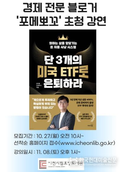 한국현대미술신문 배윤섭 기자 | 이천시 효양도서관은 시민들의 경제적 이해력 향상과 현명한 자산 관리 능력 제고를 위해 오는 11월 8일 오후 1시, '단 3개의 미국 ETF로 은퇴하라'의 저자이자 네이버 경제 전문 블로거 김지훈(필명 포메뽀꼬)을 초청해 재테크 특강을 진행한다.