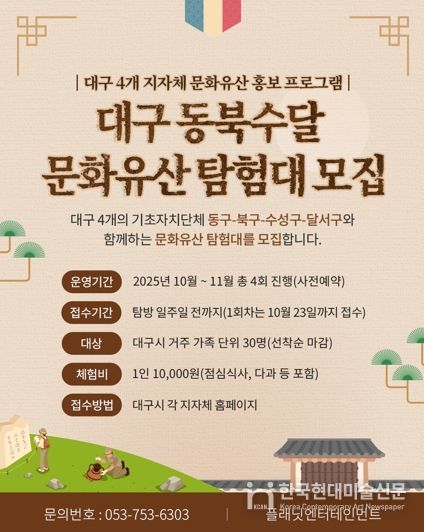 한국현대미술신문 정소영 기자 | 대구 수성구, 동구, 북구, 달서구가 협력해 지역의 역사와 문화를 함께 배우고 체험하는 ‘대구 문화유산 탐험대’ 운영을 시작한다.