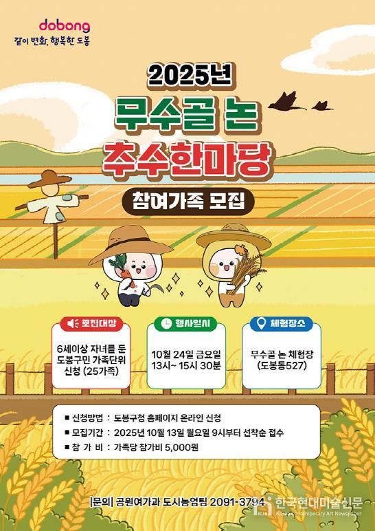 한국현대미술신문 배건 기자 | 서울 도봉구가 오는 10월 24일 무수골 친환경 논 체험장(도봉동 527)에서 ‘무수골 논 추수한마당’ 행사를 개최한다.