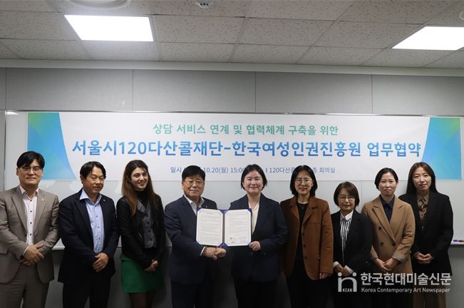 한국현대미술신문 배건 기자 | 서울시 대표적인 민원 소통 창구인 서울특별시 120다산콜재단은 10월 20일 한국여성인권진흥원과 ‘여성폭력 피해자 상담서비스 연계 및 협력체계 구축’을 위한 업무협약(MOU)을 체결했다고 밝혔다.
