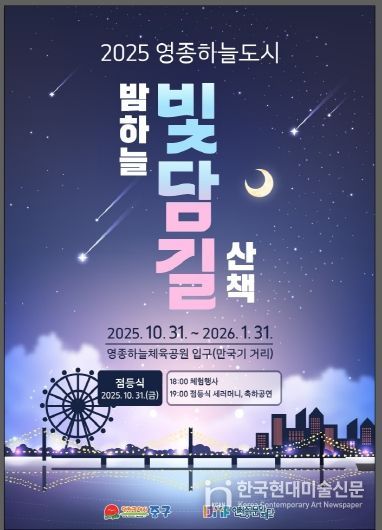 한국현대미술신문 박재남 기자 | (재)인천중구문화재단(이사장 김정헌)은 올해 10월 31일부터 오는 2026년 1월 31일까지 3개월간 야간 경관조명 ‘2025 영종 빛 축제 - 영종하늘도시 밤하늘 빛담길’을 운영한다고 밝혔다.