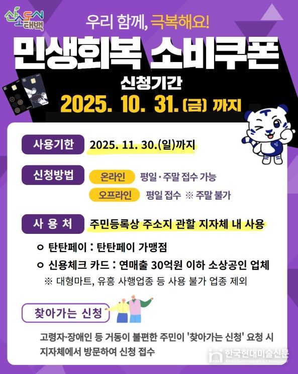 한국현대미술신문 원진 기자 | 태백시는 2차 민생회복 소비쿠폰 신청 마감이 일주일 앞으로 다가오자, 아직 신청하지 않은 시민들에게 서둘러 신청할 것을 당부했다.