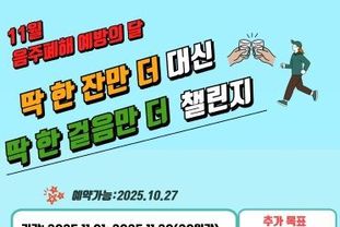 박혜련 보건소장은 “11월은 음주폐해예방의 달로 걷기와 절주를 결합한 이번 챌린지를 통해 군민이 서로 응원하며 건강한 생활습관을 만들어가길 바란다”며 “앞으로도 주민 참여형 건강증진사업을 지속적으로 추진하겠다”고 말했다.