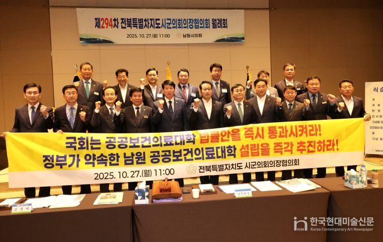 한국현대미술신문 기자 | 전북특별자치도시군의회의장협의회(회장 남관우 전주시의회 의장)는 27일 남원시의회에서 열린 제294차 월례회에서 공공의대법안 통과 촉구 건의안을 채택하고, 정부와 국회에 조속한 법안 통과를 강력히 촉구했다.
