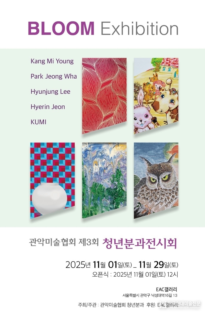 2025년 11월 1일(토) ~ 11월 29일(토), 서울 관악구에 위치한 EAC갤러리에서 관악미술협회 청년분과가 주최·주관하는 제3회 청년분과전시회 ‘BLOOM 전’이 오는 11월 1일부터 29일까지 EAC갤러리에서 개최된다.