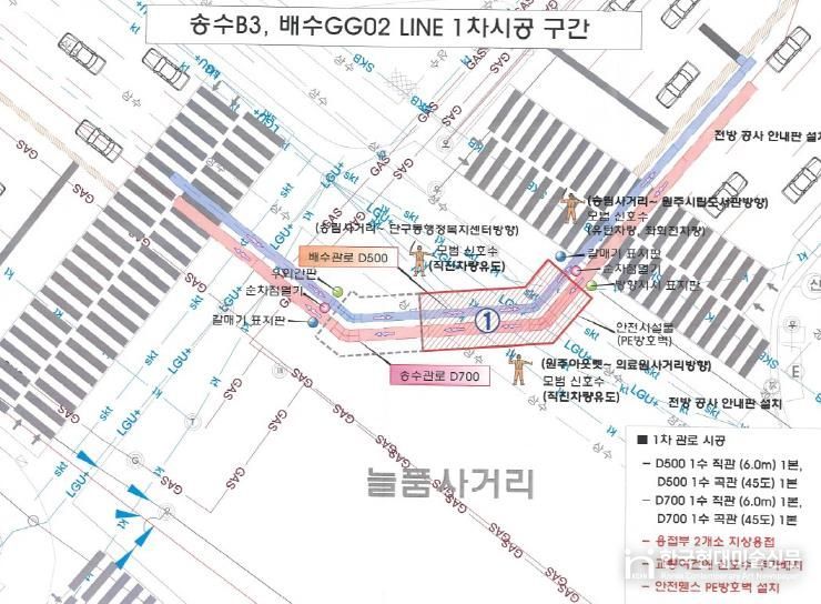 한국현대미술신문 원진 기자 | 원주시상하수도사업소는 태장배수지 설치사업의 일환으로 진행되는 늘품사거리 교차로 구간 송배수관로 설치공사를 야간에 실시한다.