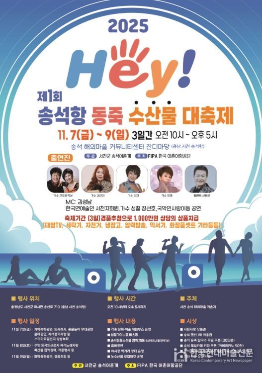 한국현대미술신문 신정은 기자 | 서천군 마서면 송석어촌계가 11월 7일부터 9일까지 사흘간 송석항 일원에서 ‘제1회 헤이(HEY) 송석항 동죽 수산물 대축제’를 연다.